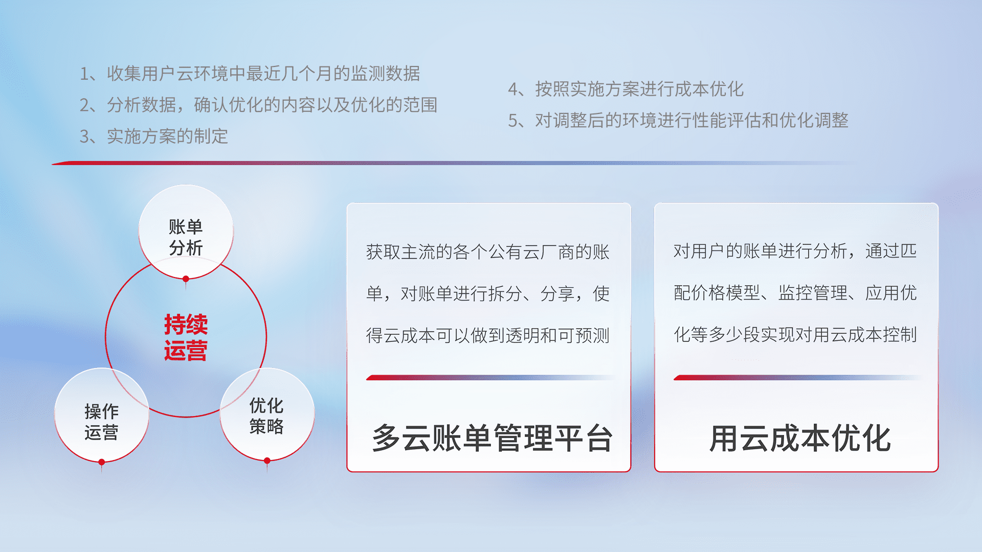通过多云纳管,,,以统一的资源数据模型把客户的云资源进行抽象和封装,,,,进而实现对多云资源的统一操作,,保障云资源管理的可靠性、、、、稳定性与可用性。。。量身定制化运维内容,,,配置、、、开发运维、、、补丁管理、、、备份、、监控、、、认证和访问管理、、、审计和日常巡检等,,,保障在用云过程中的可靠度,,,稳定度以及高可用率。。。